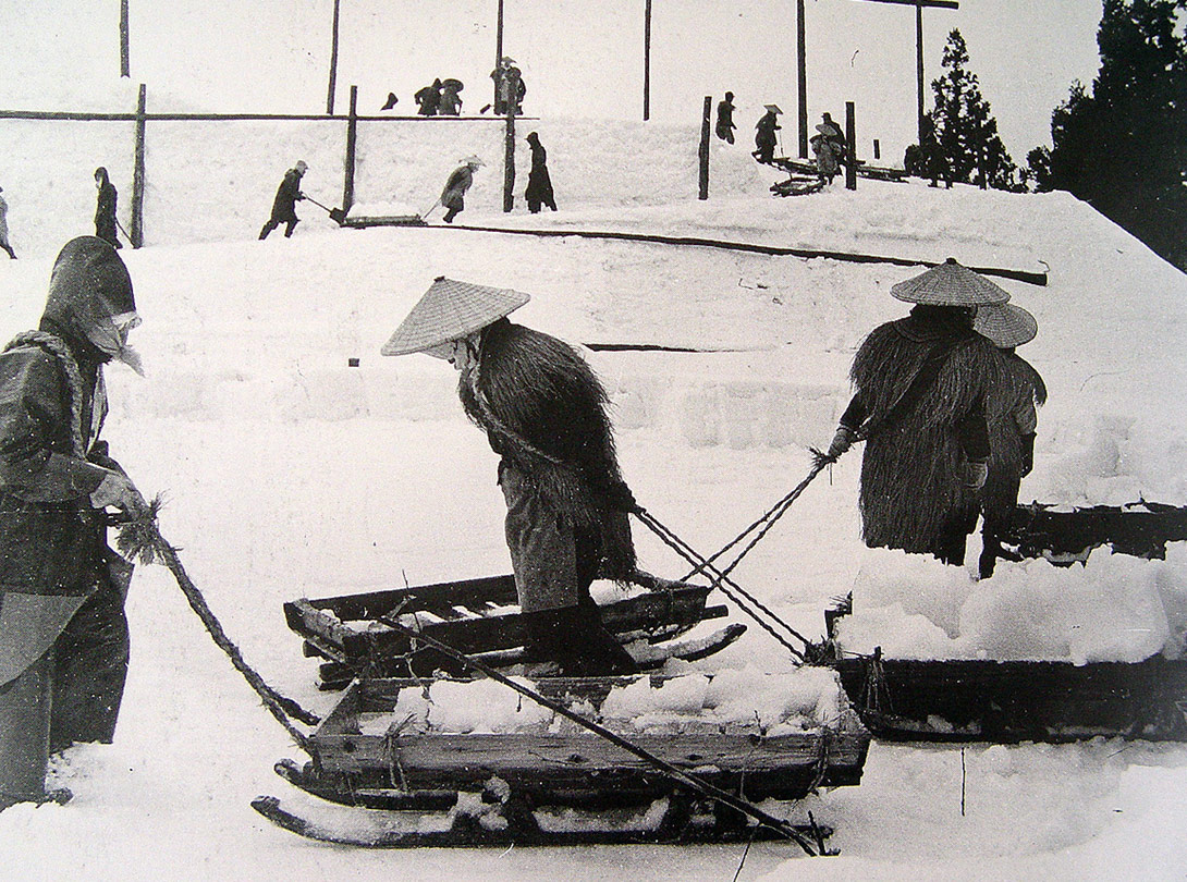 当時の雪室づくりの様子。雪をソリで運んで積み上げ、かやで覆って夏まで保存した。